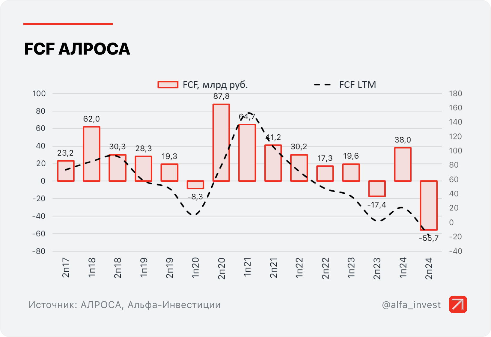 Тем не менее цены на алмазы всё ещё остаются ниже средних цен II полугодия 2024 года. В таких условиях давление на финансовые результаты компании будет сохраняться. FCF может оказаться отрицательным и в I квартале 2025 года, а вероятность дивидендных выплат будет низкая.
