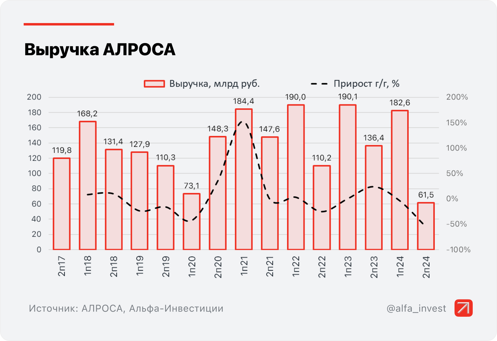 Выручка уменьшилась на 25% год к году, до 244,1 млрд руб., из-за сокращения спроса и падения цен на алмазы.