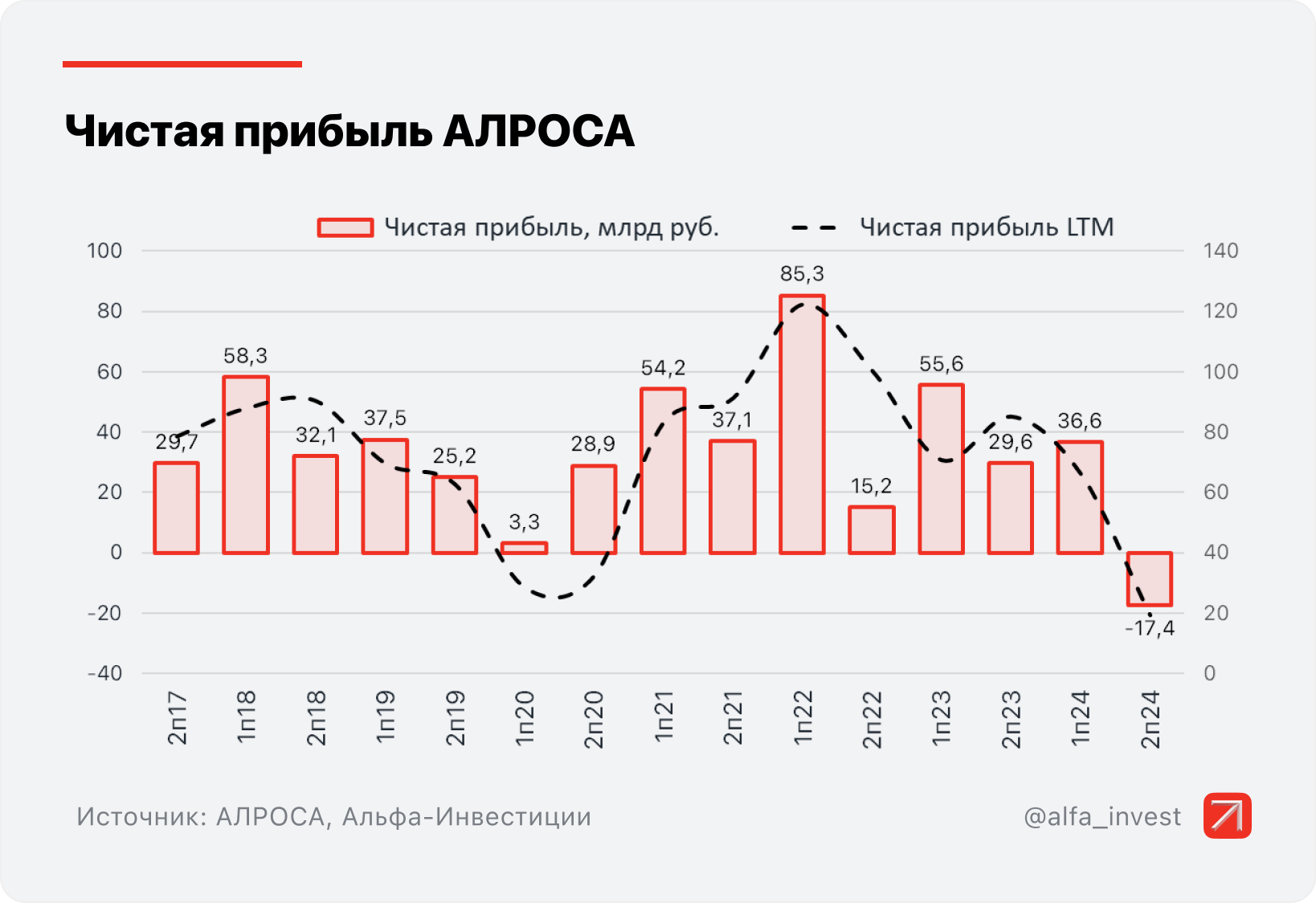 Но стоит отметить, что в сложных условиях АЛРОСА смогла получить чистую прибыль по итогам года. При этом операционные показатели компании в 2024 году сократились меньше, чем у других мировых производителей. Добыча алмазов АЛРОСА уменьшилась примерно на 5% по сравнению с конкурентами De Beers (-22%) и Rio Tinto (-15%).