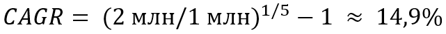 Пример 1. Инвестор вложил 1 млн руб. в акции, и через пять лет его капитал вырос до 2 млн руб. Необходимо определить, какую годовую доходность в среднем он получил.