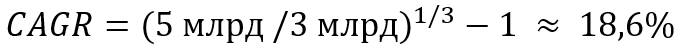 Пример 2. Выручка компании по итогам 2021 года составляла 3 млрд руб, в 2022 году она выросла до 3,1 млрд руб., в 2023 году — 3,6 млрд руб, а в 2024 году — 5 млрд руб. Задача заключается в том, чтобы выяснить, на сколько процентов в среднем росла выручка компании за прошедшие три года.
