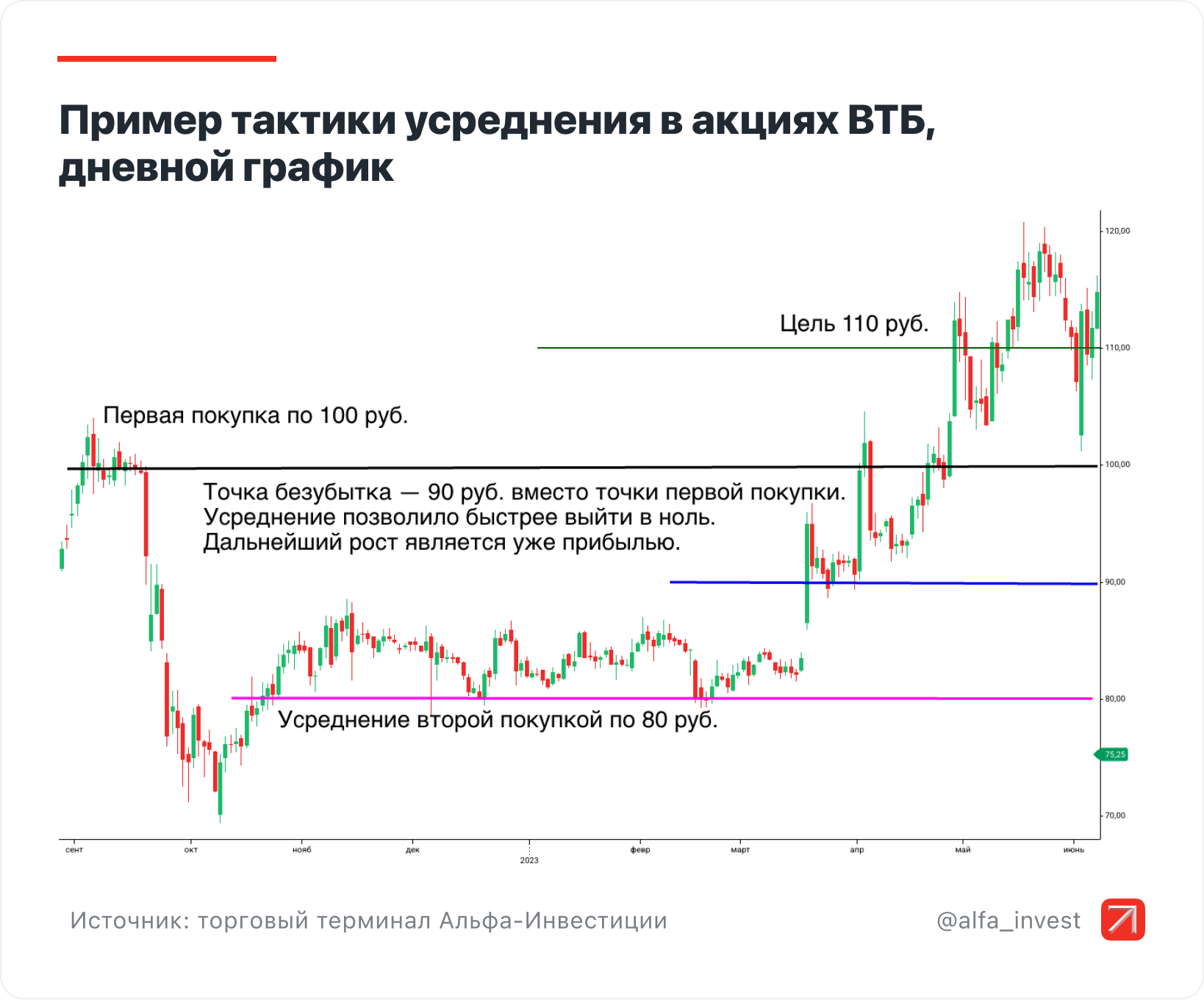 Например, инвестор купил акцию по 100 руб., и цена упала до 80 руб. Он покупает ещё одну акцию, и теперь средняя цена владения составляет 90 руб. Если цена вырастет до 95 руб., инвестор получит прибыль 5,6%, хотя начальная цена (100 руб.) ещё не достигнута.