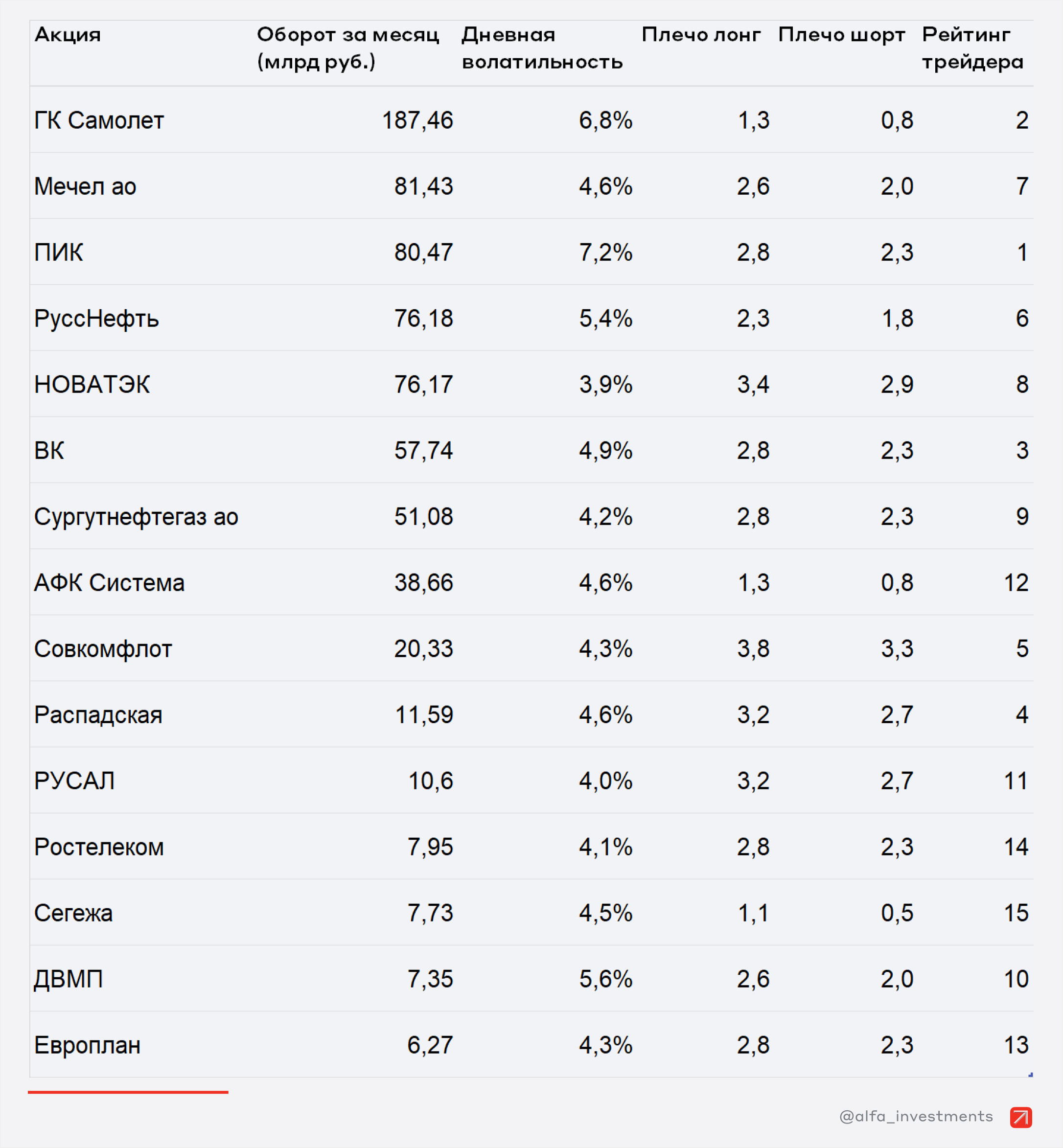 Ниже в таблице собраны 15 наиболее подходящих бумаг. Одни берут волатильностью, другие — оборотом и щедрым доступом к заёмным деньгам брокера. Отберём из них несколько штук под разные цели и стратегии.
