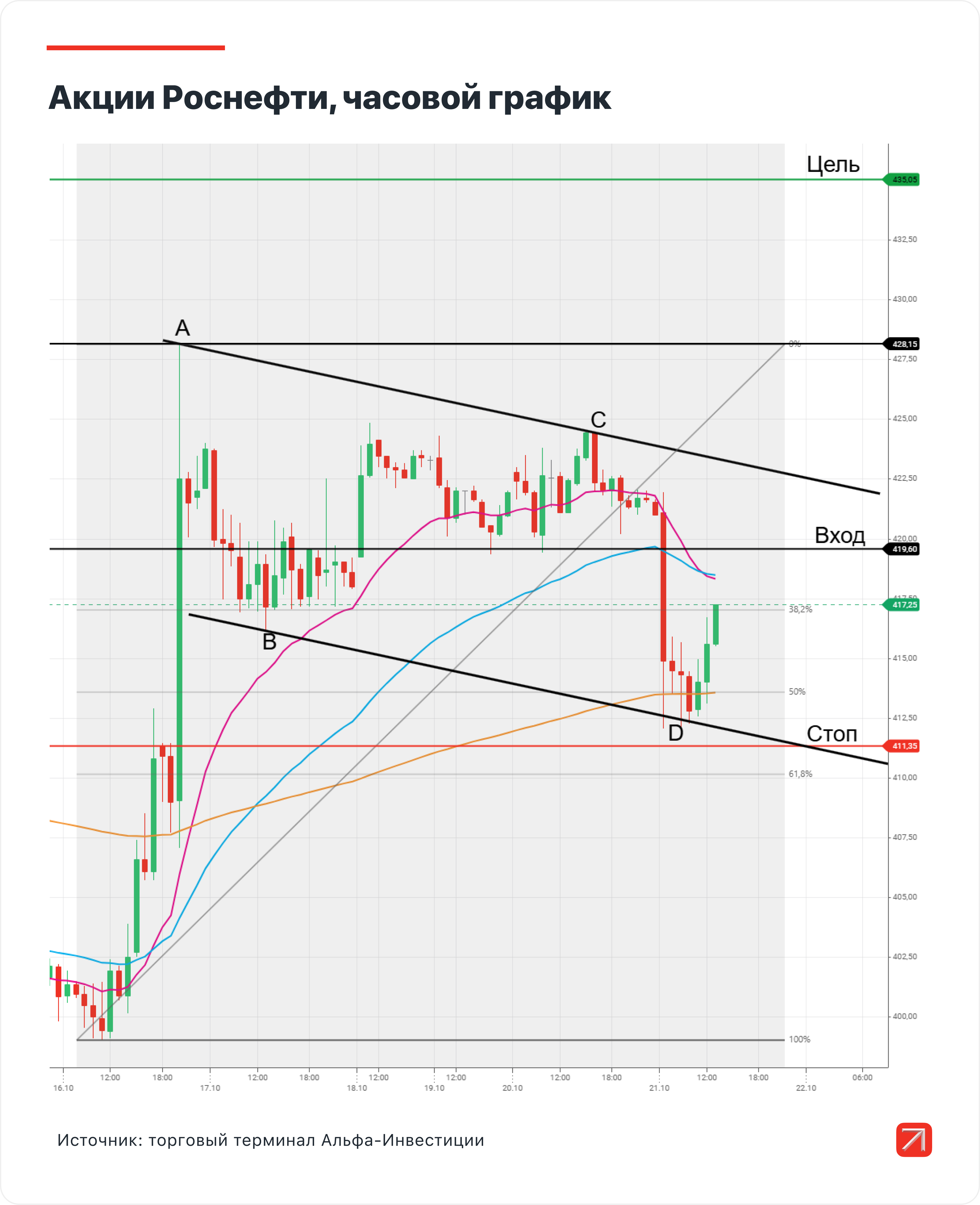 При достижении уровня точки A (значение 428,15 руб.) необходимо перенести стоп на уровень 420,85 руб. (безубыток с учётом комиссии), а при достижении цели 435,05 руб. — продать всю позицию.