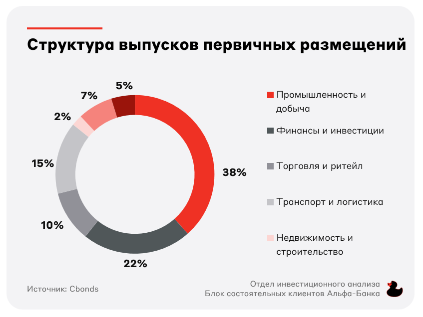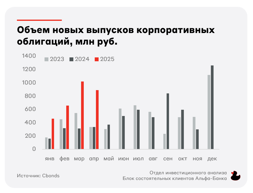 В апреле 2025 года первичный рынок корпоративных облигаций продолжил рост: было размещено 68 публичных выпусков на общую сумму 892 млрд рублей (без учёта однодневных выпусков). Несмотря на сокращение объёма новых рыночных выпусков на 13% м/м, к апрелю прошлого года показатель вырос на 266% г/г, заняв второе место с начала года и четвёртое за последние 10 лет. Первичные размещения преимущественно пришлись на реальный сектор (~80% объёма).
