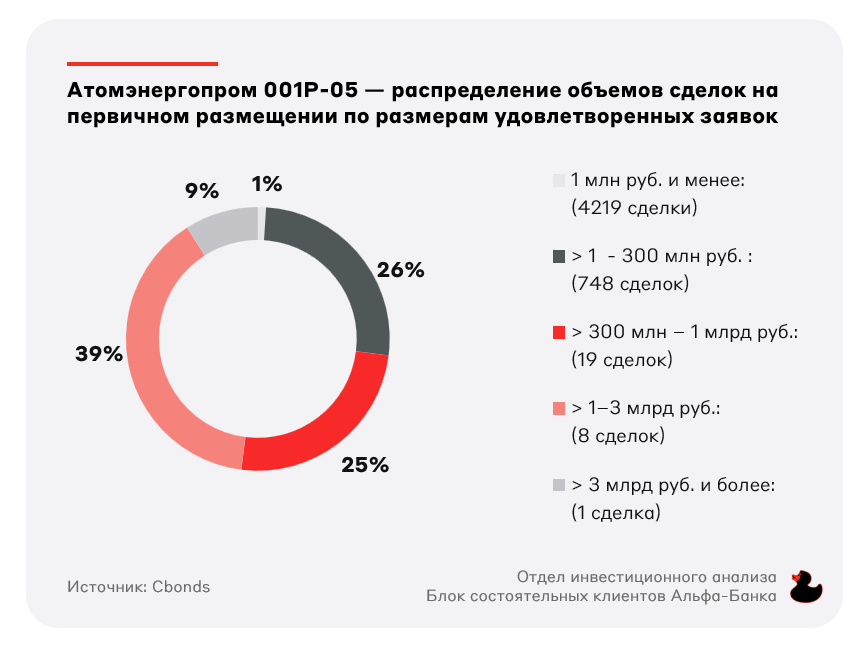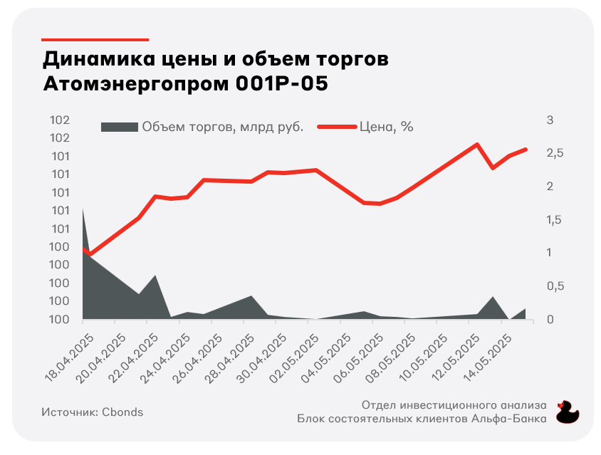 Для сравнения инвестор мог купить Атомэнергопром 001P-05 на объём несколько млрд руб. на первичном размещении по 100% от номинала. При этом если не считать первую неделю торгов, средний объём сделок на вторичном рынке по бумаге составил 100 млн руб. в день.