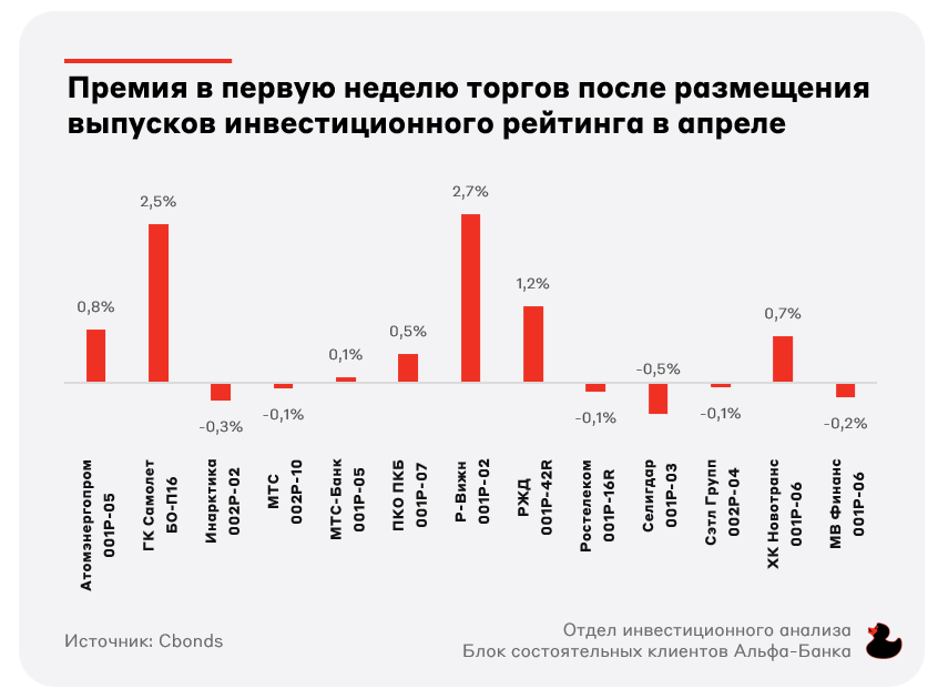 Так, с начала года из 56 размещений инвестиционного рейтинга с фиксированным купоном 45 закрыли первую неделю торгов с премией к номиналу, а среднее значение премии составило 0,9%. В апреле первичный рынок показал более скромные результаты по причине насыщения рынка предложением: из 13 размещений инвестиционного рейтинга с фиксированным купоном 7 закрыли первую неделю торгов с премией к номиналу около 0,6%.
