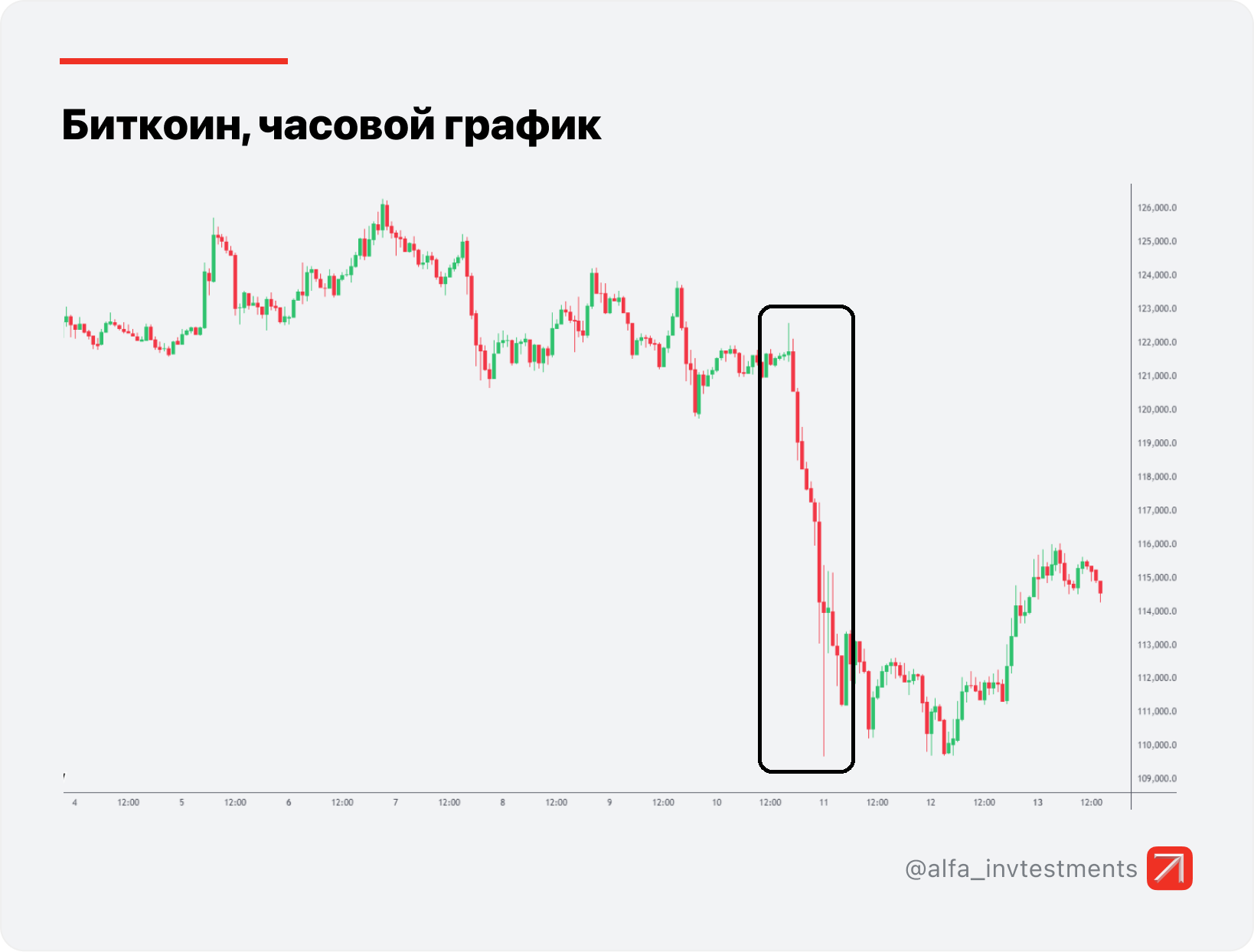 Так как традиционные рынки в этот момент были закрыты, весь негатив сосредоточился на криптовалютном рынке. Цена биткоина в моменте опускалась ниже $110 000.