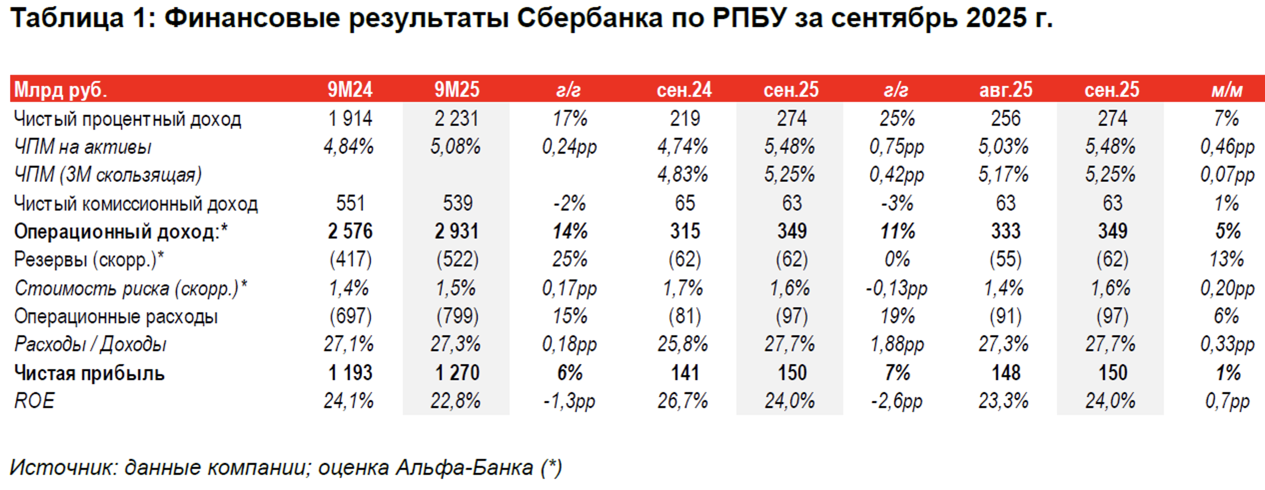 Сбербанк (SBER RX / SBERP RX: ВЫШЕ РЫНКА, РЦ: 380 руб.) представил результаты по РПБУ за сентябрь и 9М25. Чистая прибыль в сентябре составила 150 млрд руб. (+7% г/г, +1% м/м), ROE – 24%. По итогам 9М25 прибыль составила 1,27 трлн руб. (+6% г/г, ROE – 22,8%). На наш взгляд, с учетом текущих условий банк демонстрирует сильные результаты, однако с точки зрения динамики акций они выглядят скорее нейтрально и соответствуют нашим ожиданиям на 2025 г. (рост прибыли приблизительно на 5%, ROE – около 22%). По нашим оценкам, при текущих котировках акции Сбербанка торгуются с коэффициентами P/E и P/BV 2025П на уровнях соответственно 3,9х и 0,8х, при дивидендной доходности 12,9%, что представляется справедливой оценкой с учетом текущих доходностей гособлигаций. В то же время, на наш взгляд, Сбербанк может стать одним из бенефициаров положительного развития событий на макроуровне.
