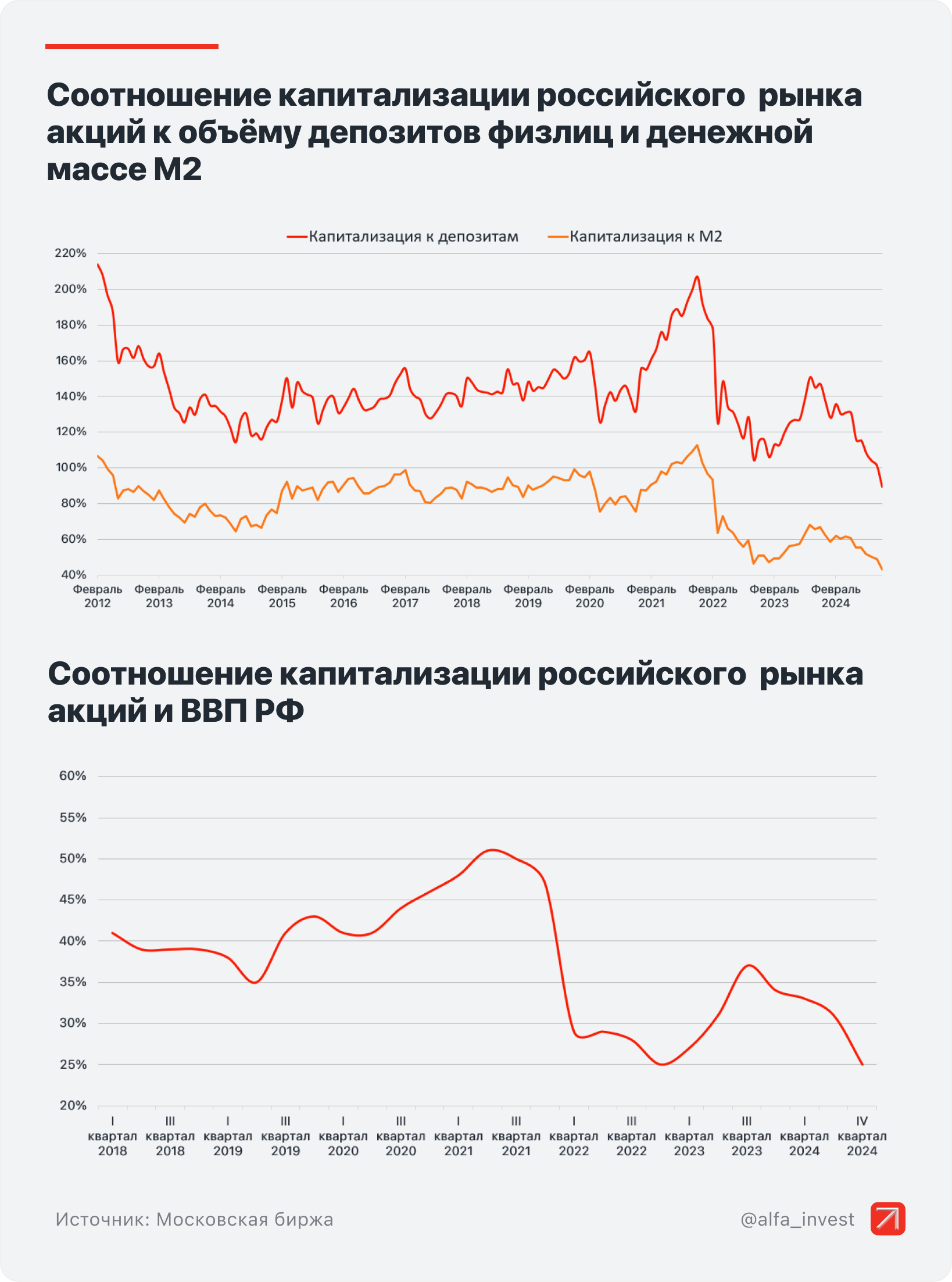 Рекордно низкие оценки. Соотношение рыночной капитализации всех акций на Московской бирже и средств на вкладах физлиц к декабрю 2024 года достигло 0,89 — это рекордно низкий уровень в современной истории. Чтобы коэффициент вернулся к средним значениям 2012–2023 годов (1,45), капитализация рынка акций должна вырасти на 60%. Если соотнести рыночную капитализацию с денежной массой и с ВВП, то и здесь рынок акций окажется на многолетних минимумах.
