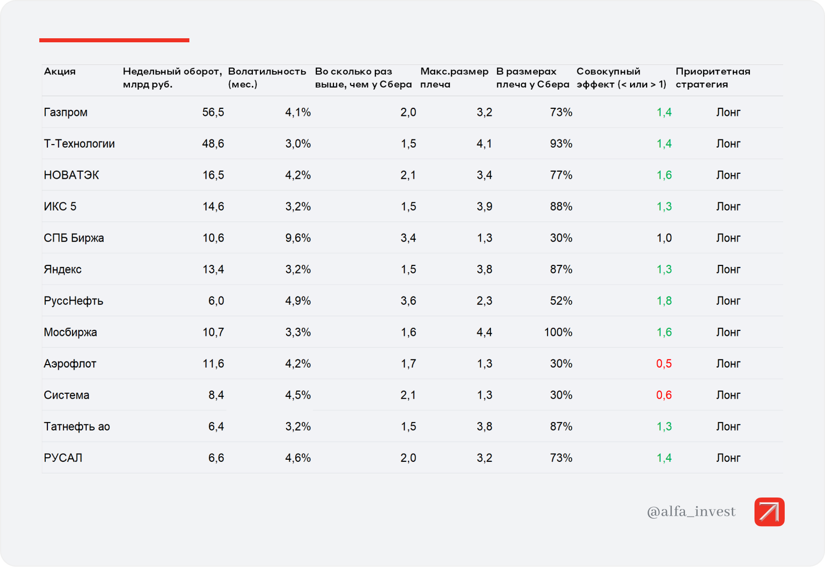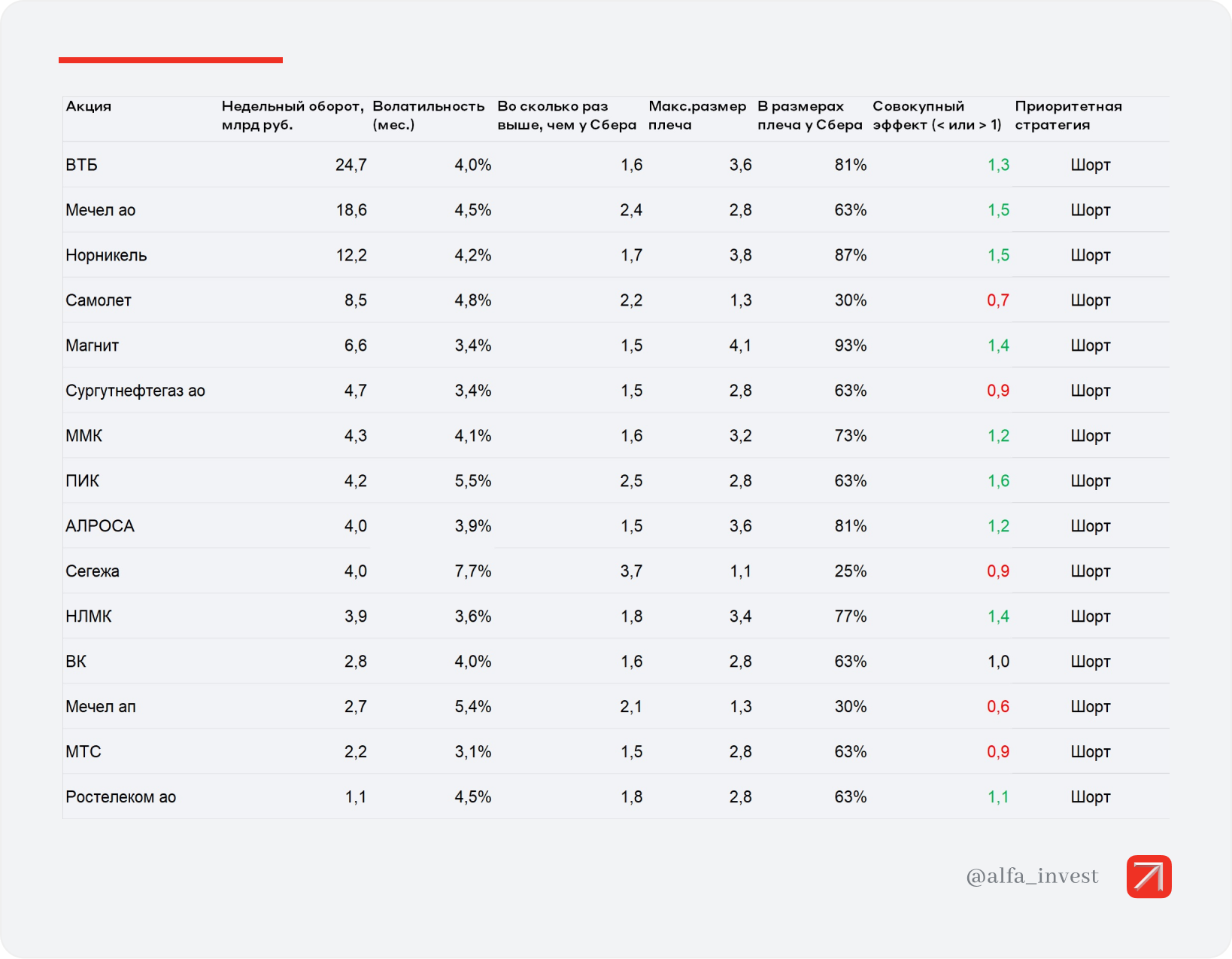Во второй таблице по той же методике собраны акции с оптимальным набором трёх параметров (ликвидность, волатильность, плечи), но с фокусом на шорт. Сейчас эти бумаги интересны для продажи с горизонтом до месяца.
