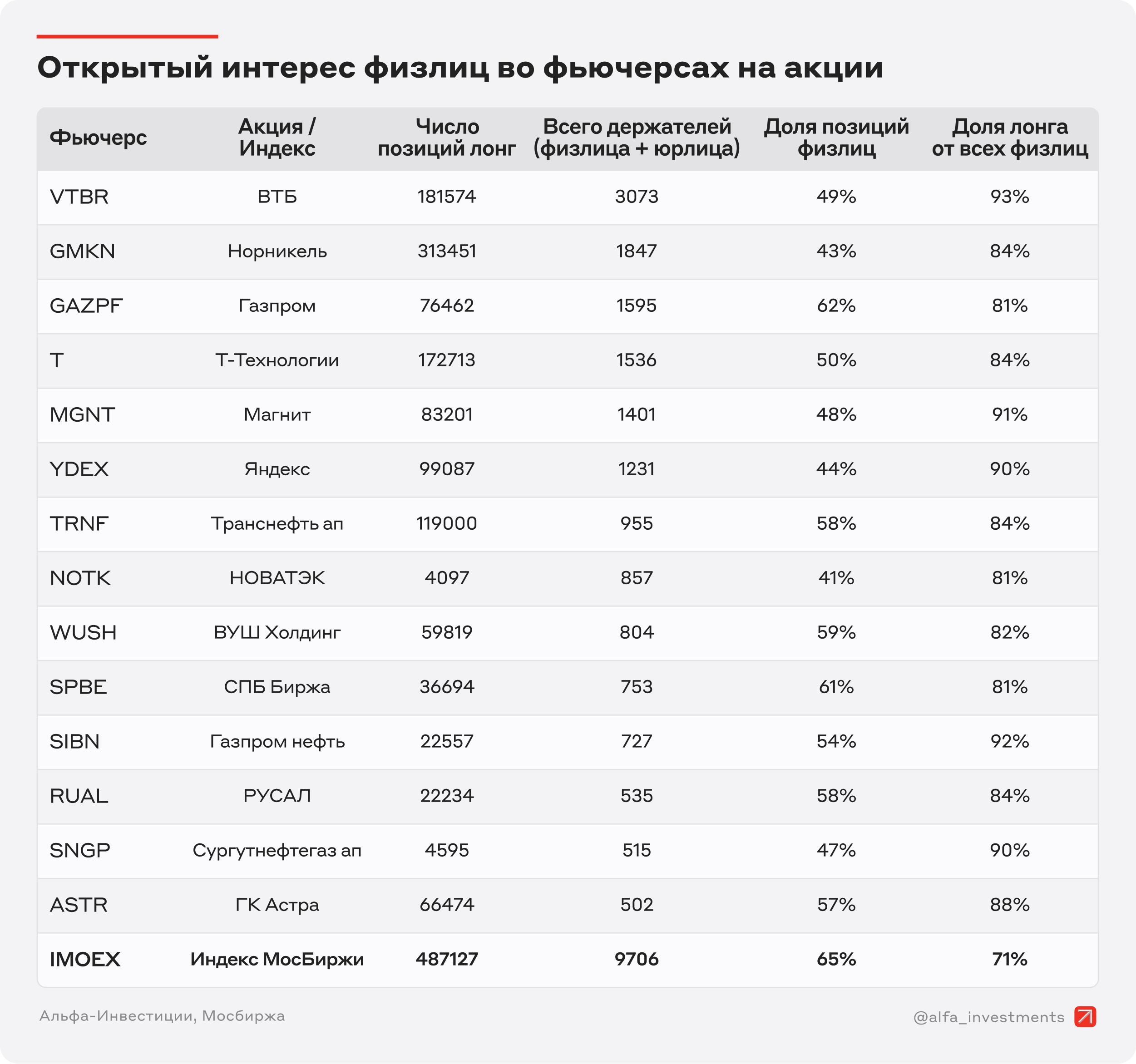 Также приведены данные о том, какая доля всех фьючерсов принадлежит физлицам, и какой открытый интерес сейчас у индекса в целом. 71% трейдеров ставит на рост рынка, а у отдельных акций оптимистов ещё больше.