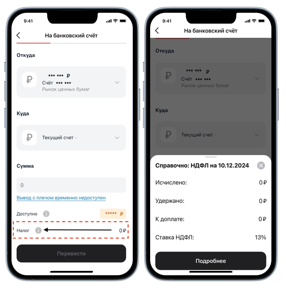 Экспресс-вариант. Узнать информацию о налогах можно, создавая заявку на вывод денег с брокерского счёта. При подаче поручения внизу формы будет указана доступная сумма к выводу и сумма налога. В строке Налог можно увидеть детали, нажав «i».