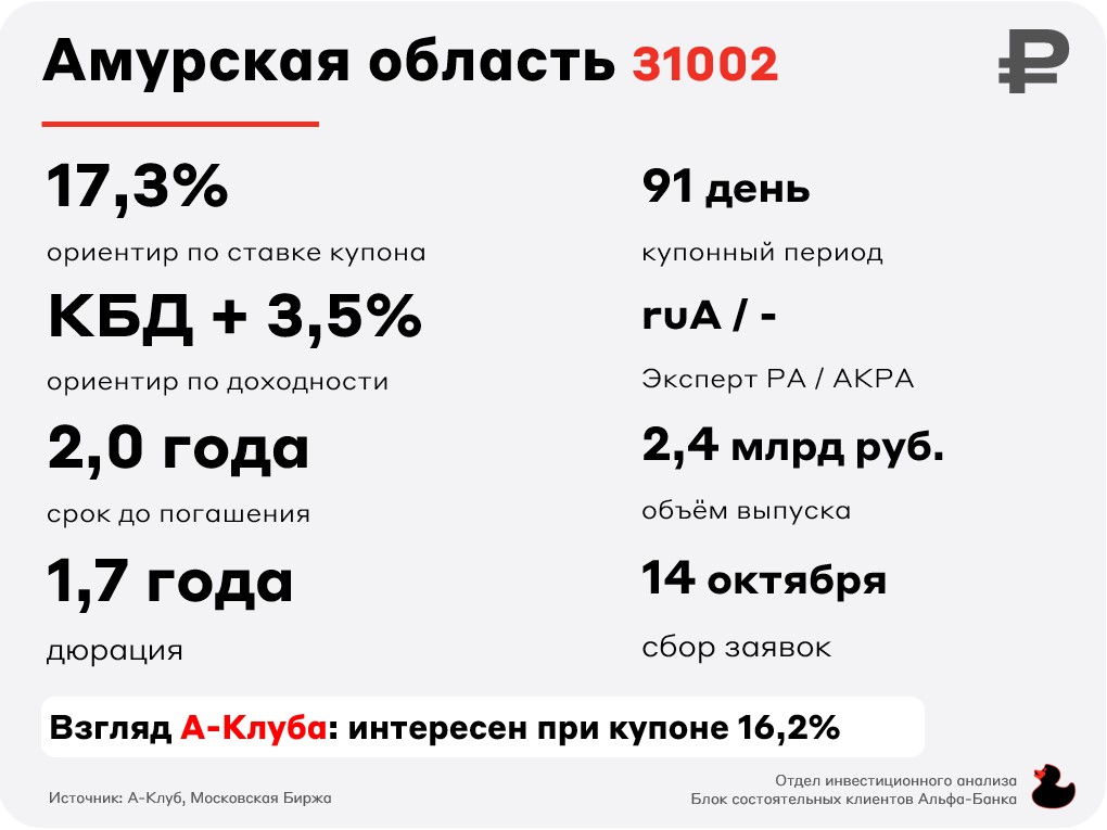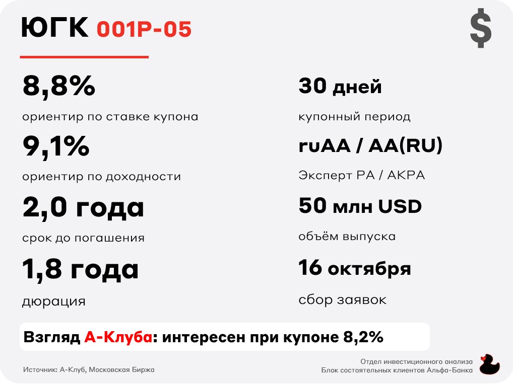 Наиболее интересными инструментами на первичном рынке выглядят долларовые выпуски ЮГК 001Р-05 и Газпром нефть 005Р-01R, а также рублёвые выпуски Амурская область 31002 и Авто Финанс Банк БО-001Р-16.