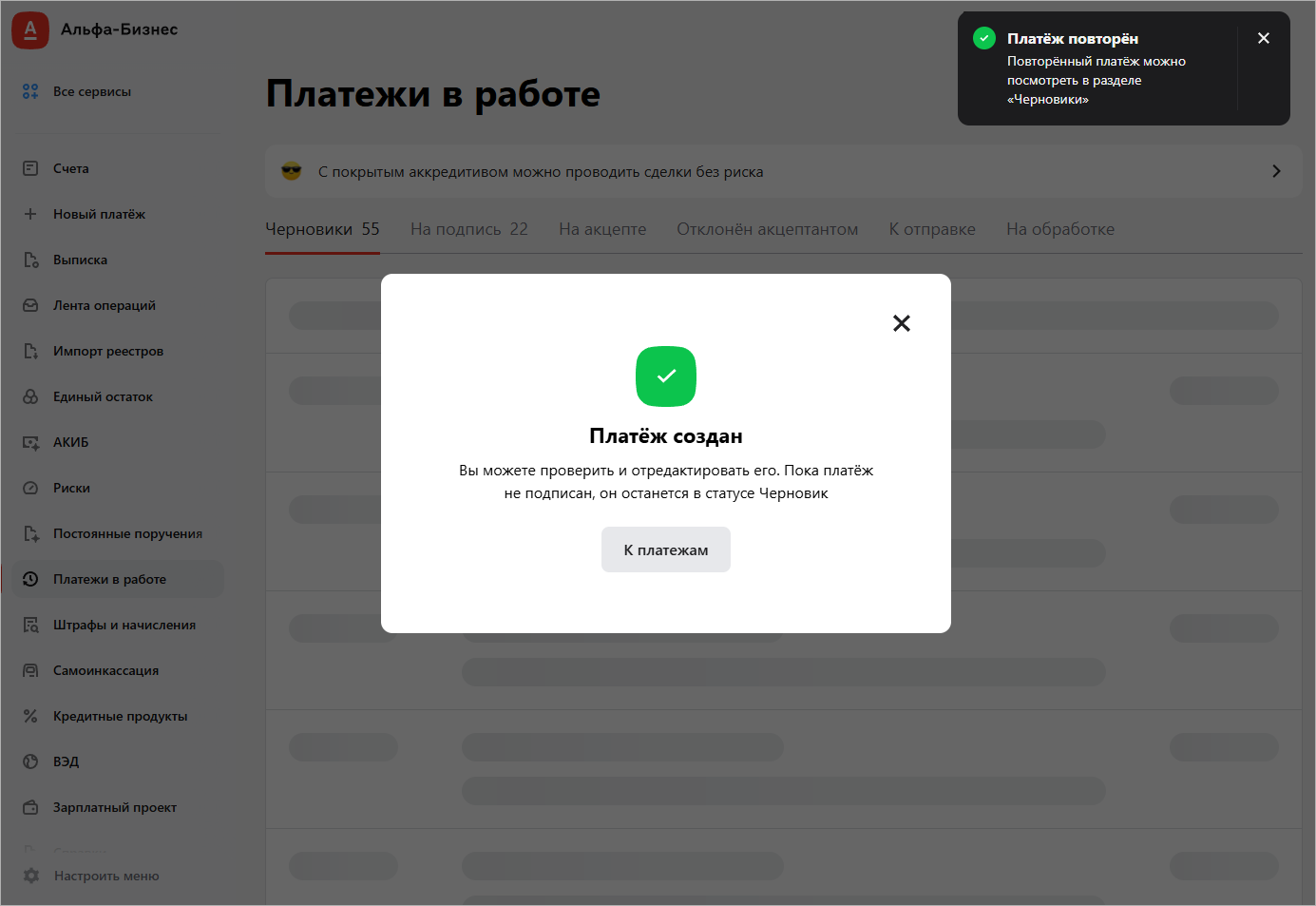 Вы увидите уведомление, что платёж добавлен в Черновики: