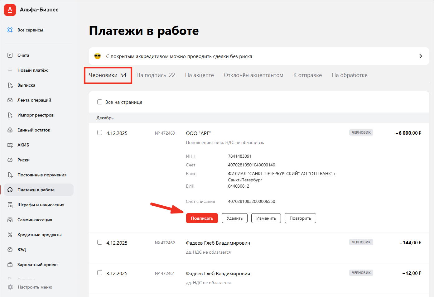 Платёж будет скопирован. Найдите его на вкладке Черновики и нажмите Подписать: