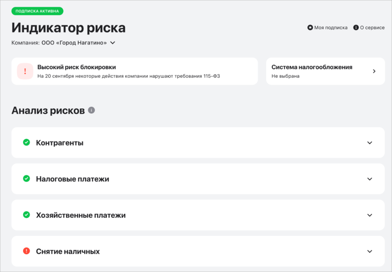 На странице сервиса вы можете увидеть общий уровень риска блокировки счёта по вашей компании: